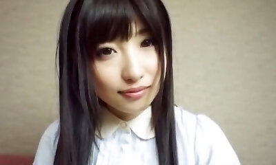 18-year-old lovely black-haired Japanese beauty. She gives a blowjob and has creampie sex in her shaved fuckbox. Uncensored