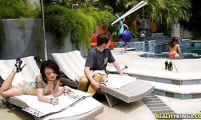 Brunette honey have interracial fun outside at pool